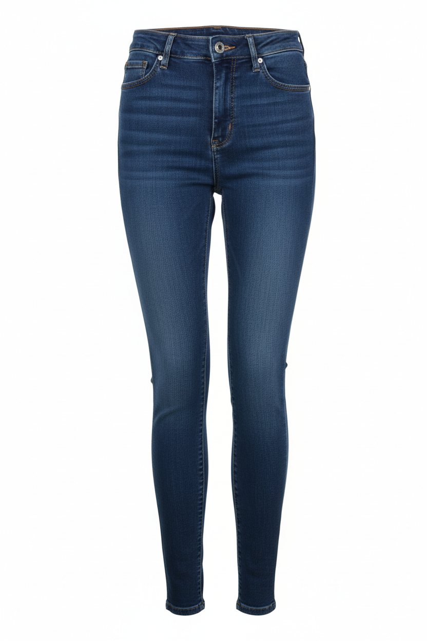 Calça jeans skinny de cintura alta. Tecido com elastano para conforto e modelagem perfeita.